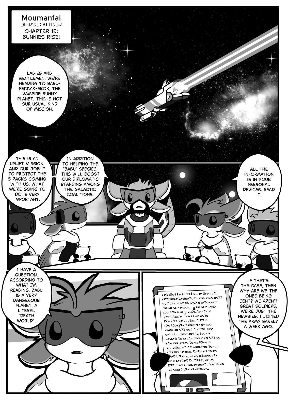 TranscriptPanel 1 has an Avali spaceship flying across the cosmos. Someone says "Ladies and gentlemen, we're heading to Babu-Pekkak-Erok, the Vampire Bunny planet. This is not our usual kind of mission". Panel 2 shows five Avali across a table, the one in the center saying "This is an uplift mission, and our job is to protect the 5 packs coming with us. What we're going to do is very important. In addition to helping the 'Babu' species, this will boost our diplomatic standing among the Galactic Coalitions. All the information is in your personal devices. Read it". Panel 3 has one Avali saying "I have a question. According to what I'm reading, Babu is a very dangerous planet. A literal 'Death World'.". Panel 4 shows that Avali tablet displaying text in Standard Galactic Alphabet. She continues. "If that's the case, then why are we the ones being sent? We aren't great soldiers, we're just newbies. I joined the army barely a week ago". |
