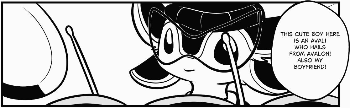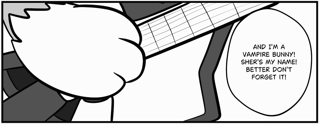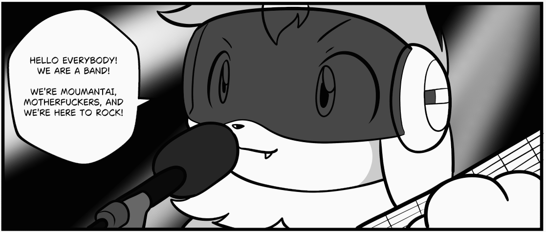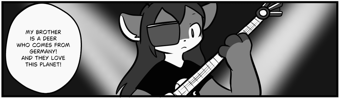 TranscriptPanel 1 shows Sher singing "Hello everybody! We are a band! We're Moumantai Motherfuckers, and we're here to rock!". Panel 2 shows Rowi drumming, while the singing continues. "This cute boy here is an Avali who hails from Avalon! Also my boyfriend!". Panel 3 shows Daniel playing their instrument. The singing continues. "My brother is a deer who comes from Germany! And they love this planet!". Panel 4 shows Sher playing the guitar. "And I'm a vampire bunny! Sher's my name! Better don't forget it!". |