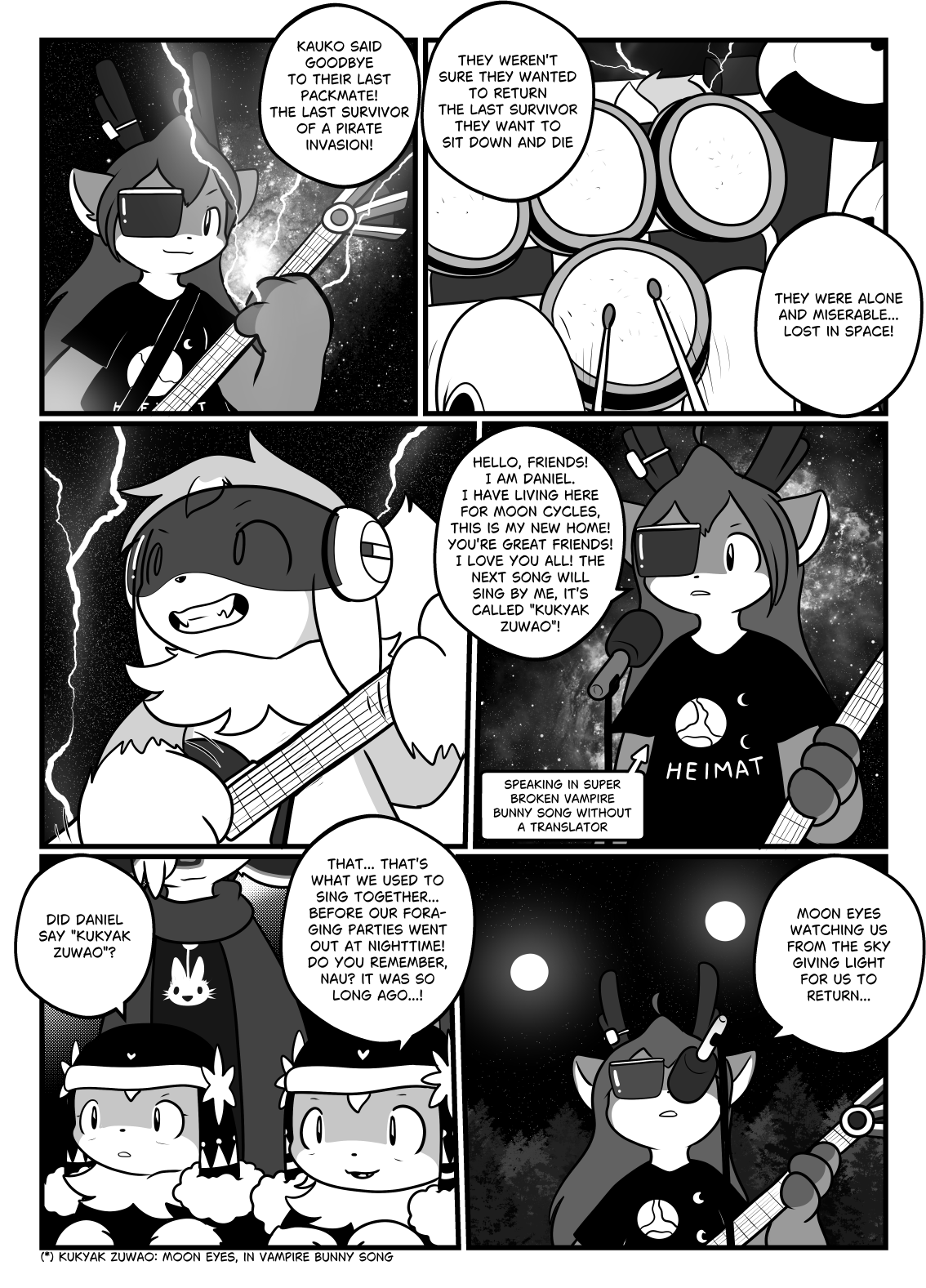 TranscriptPanel 1 shows Daniel playing their bass while the singing goes. "Kauko said goodbye to their last packmate! The last survivor of a pirate invasion!". Panel 2 shows Rowi's drumkit being hit. "They weren't sure they wanted to return, the last survivor, they want to sit down and die. They were alone and miserable... lost in Space!". Panel 3 shows Sher playing a guitar solo while grinning. Panel 4 Daniel is talking, in extremely broken Vampire Bunny song (without using a translator). "Hello, Friends! I am Daniel. I have living here for moon cyvles, this is my new home! You're great friends! I love you all! The next song will sing by me, it's called 'Kukyak Zuwao'!". Panel 5 Nau says "Did Daniel say 'Kukyak Zuwao'?" and Khi replies "That... that's what we used to sing together... before our foraging parties went out at nighttime! Do you remember, Nau? It was so long ago...!". Panel 6 D is singing. The projectors change the background so two moons are shown behind them. "Moon eyes watching us from the sky, giving light for us to return...". |