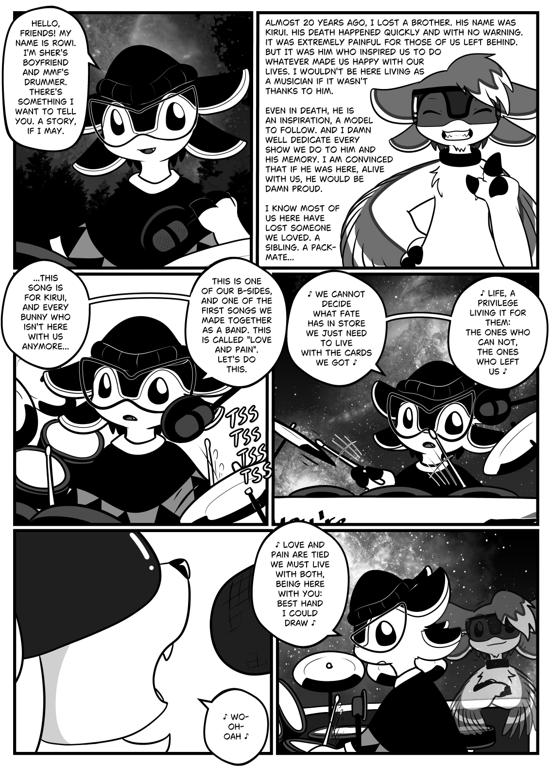 TranscriptPanel 1 shows Rowi adjusting a microphone next to him. He says "Hello, friends! My name i Rowi. I'm Sher's boyfriend and MMF's drummer. There's something I want to tell you, a story, if I may". Panel 2 shows an avali grinning. "Almost 20 years ago, I lost a brother. His name was Kirui. His death happened quickly and with no warning. It was extremely painful for those of us left behind, but it was him who inspired us to do whatever made us happy with our lives. I wouldn't be here living as a musician if it wasn't thanks to him. Even in death, he is an inspiration, a model to follow. And I damn well dedicate every show to him and his memory. I am convinced that if he was here, alive with us, he would be damn proud. I know most of us here have lost someone we loved. A sibling, a packmate..." Panel 3 Rowi starts playing while talking "...This song is for Kirui and every bunny who isn't here with us anymore. This is one of our B-Sides, and one of the first songs we made together as a band. This is called 'Love and Pain', let's do this". Panel 4 Rowi is the one singing. "We cannot decide what fate has in store, we just need to live with the cards we got. Life, a privilege, living it for them: The ones who can not, the ones who left us". Panel 5 shows Sher saying "Wo-oh-oah". Panel 6 Rowi continues "Love and pain are tied, we must live with both, being here with you: Best hand I could draw". The spirit of Kirui is behind Rowi, bopping his head along. |