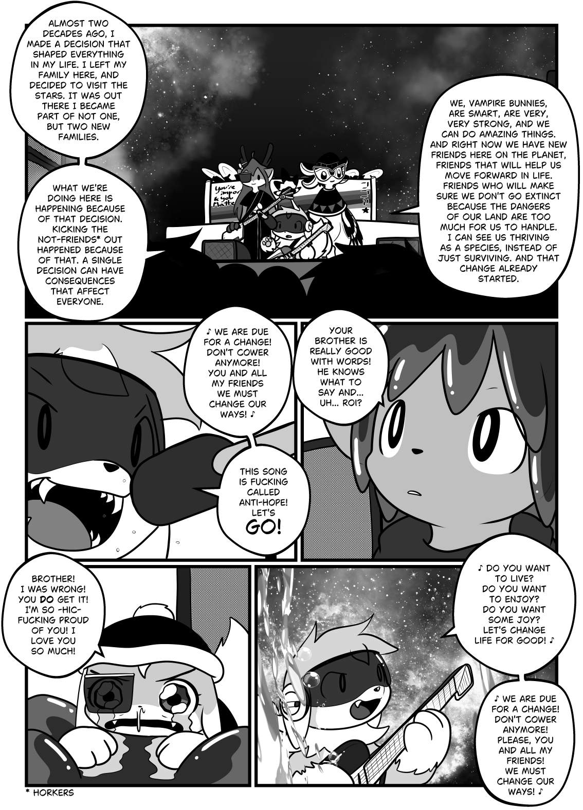 TranscriptPanel 1 shows the band together. Sher says "Almost two decades ago, I made a decision that shaped everything in my life. I left my family here, and decided to visit the stars. It was out there I became part of not one, but two new families. What we're doing here is happening because of that decision. Kicking the not-friends out happened because of that. A single decision can have consequences that affect everyone. We vampire bunnies are smart, are very, very strong, and we can do amazing things. And right now, we have new friends here on the planet. Friends that will help us move forward in life, friends who will make sure we don't go extinct because the dangers of our land are too much for us to handle. I can see us thriving as a species, instead of just surviving. And that change already started". Panel 2 Sher is talking to the microphone, with tiny drops of saliva coming out. "We are due for a change! Don't cower anymore! You and all my friends! We must change our ways! This song is fucking called Anti-Hope! Let's Go!". Panel 3 shows Mekari looking up. "Your brother is really good with words! He knows what to say and... uh... Roi?". Panel 4 shows Roi with an exaggerated crying expression. "Brother! I was wrong! You DO get it! I'm so -hic- fucking proud of you! I love you so much!". Panel 5 Sher is singing, with the projection around him looking like water. "Do you want to live? Do you want to enjoy? Do you want some joy? Let's change life for good! We are due for a change! Don't cower anymore! Please, you and all my friends! We must change our ways!". |
