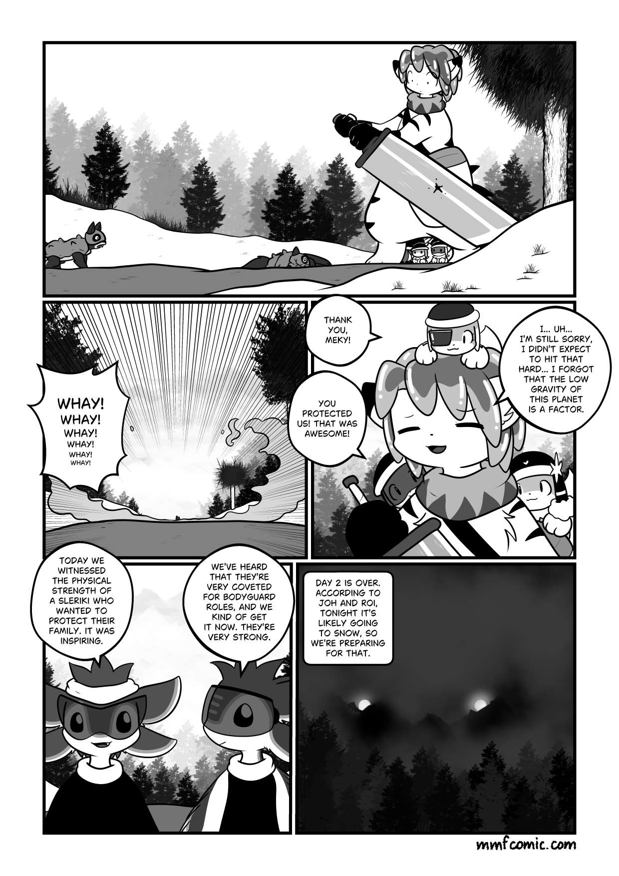TranscriptPanel One: Shows Mekari standing to the right, his sword held in a defensive position. He looks shocked as in the middle of the panel the first alien dog lies dead in the road. Panel 2: Shows the remaining predator running away with "Whay Whay Whay" screams growing smaller into the distance. Panel 3: Shows a close up of a sheepish looking Mekari who has Bunnies swarming over him enthusiastically. Panel 4: Shows K'auzau and Kyat up close Kyat: We've heard that they're coveted for Bodyguard roles and we kind of get it now. They're very strong. Panel 5: The fog is rolling in, the moons are rising above the mountains. |