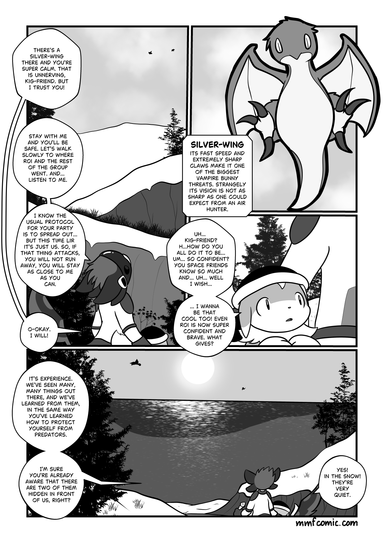 TranscriptPanel 1: Lir: "There's a silver-win there and you're super calm. That is unnerving Kig-Friend but I trust you!" Panel 2: Text Box: Panel 3: Lir: "Uh... Kig-Friend? H... how do you all do it be... um... so confident? You space friends know so much and uh... well I wish... I wanna be that cool too! Even Roi is now super confident and brave, what gives?" Panel 4: Kig: "It's experience, we've seen many things out there, and we've learned from them. In the same way you've learned how to protect yourself from predators. I'm sure you're already aware that there are two of them hidden in front of us, right?" |