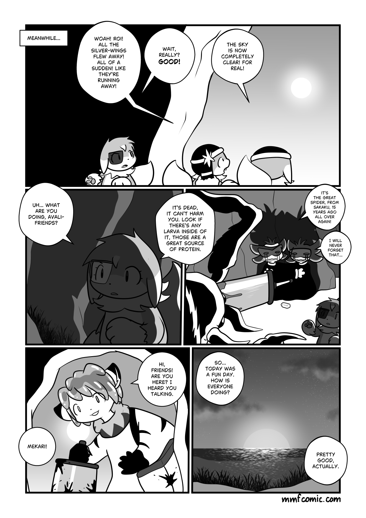 TranscriptPanel 1: Joh: "Woah! ROI! All the silver-wings flew away! All of a sudden! Like they're running away!" Panel 2: Roi: "Uh... what are you doing Avali friends? It's dead. It can't harm you. Loof if there's any larva inside of it those are a great source of protein" Panel 3: K'auzu: "It's the great spider from Sakaku, 15 years ago all over again" Panel 5: Someone: "Mekari!" Panel 6: "So today was a fun day. How is everyone doing?" |