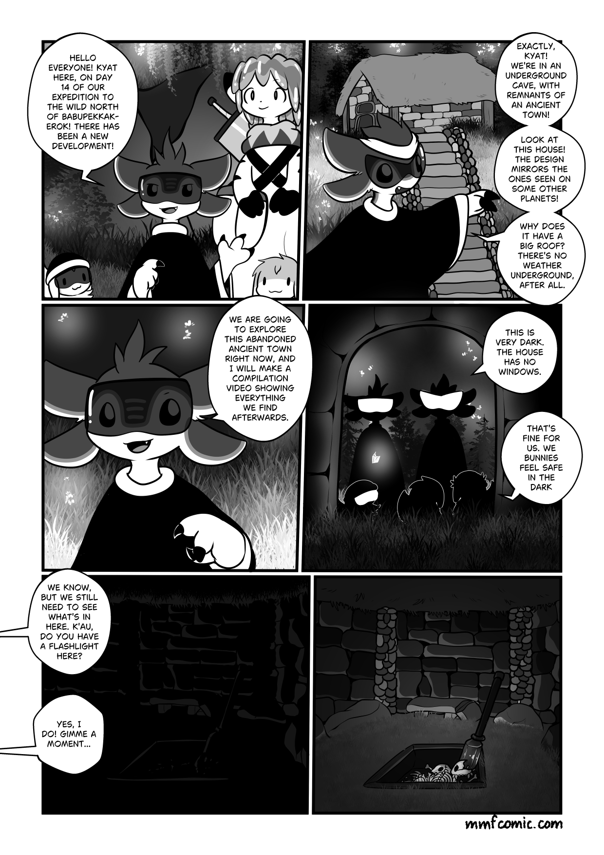 TranscriptPanel 1: Kyat: "Hello everyone, Kyat here on day 14 of our expedition to the wild north of Babupekkakerok! There has been a new development!" Panel 2: K'auzau: "Exactly Kyat! We're in an underground cave, with remnants of an ancient town! Look at this house! The design mirrors the ones seen on some other planets! Why does it have a big roof? There's no weather underground after all." Panel 3: Panel 4: Kyatt: "This is very dark. The house has no windows." Panel 5: Kyatt: "We know but we still need to see what's in here. K'au do you have a flashlight here?" Panel 6: |