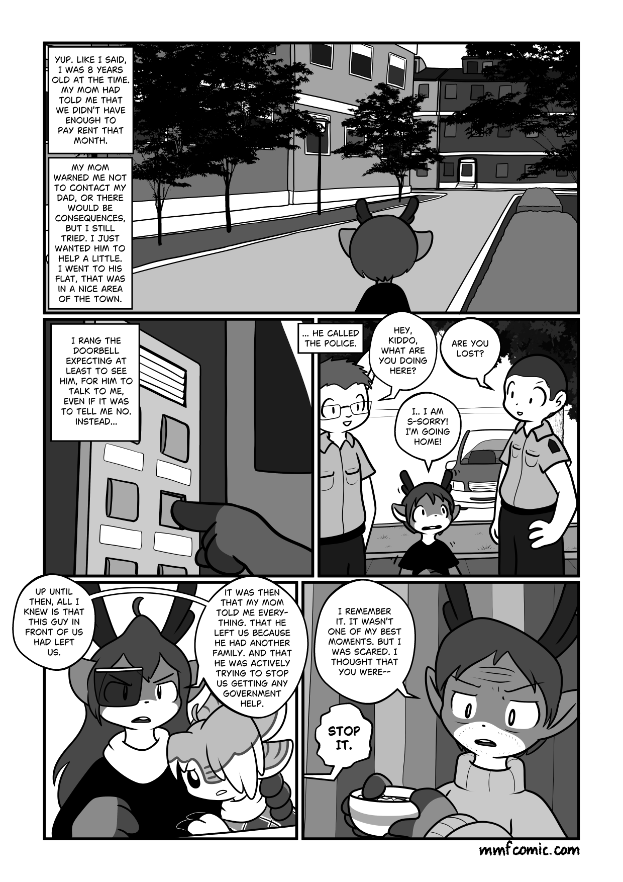 TranscriptPanel 1: A text box says: "My mom warned me not to contact my Dad, or there would be consequences. But I still tried. I just wanted him to help a little. I went to his flat, that was in a nice area of the town." Panel 2: Panel 3: Daniel's narration: "...He called the police" Bunny policeman: "Hey kiddo what are you doing here?" Panel 4: "It was then that my mom told me everything. That he left us because he had another family. And that he was actively trying to stop us getting any government help" Panel 5: "I remember it. It wasn't one of my best moments. But I was scared. I thought that you were..." Daniel: "STOP IT." |