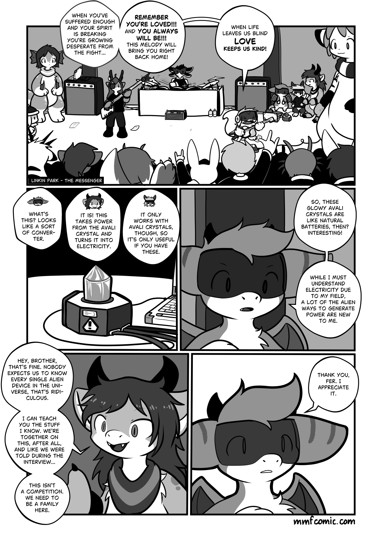TranscriptPanel 1: Roi and Kyb are on the left. There is a crowd along the front with various Aliens all rocking out happily. "When you've suffered enough and your spirit is breaking you're growing desperate from the fight... REMEBER YOU'RE LOVED and YOU ALWAYS WILL BE!!!! This melody will bring you right back home! When life leaves us blind LOVE KEEPS US KIND!!!!" Panel 2: Ved'rn: "What's this? Looks like a sort of converter." Fer: "It is! This takes power from the Avali crystal and turns it into electricity" Sayn: "It only works with Avali Crystals, though, so it's only useful if you have these." Panel 3: While I must understand electricity due to my field, a lot of the alien ways to generate power are new to me." Panel 4: "I can teach you the stuff I know. We're together on this after all and like we were told during the interview... this isn't a competition. We need to be a family here." Panel 5: |