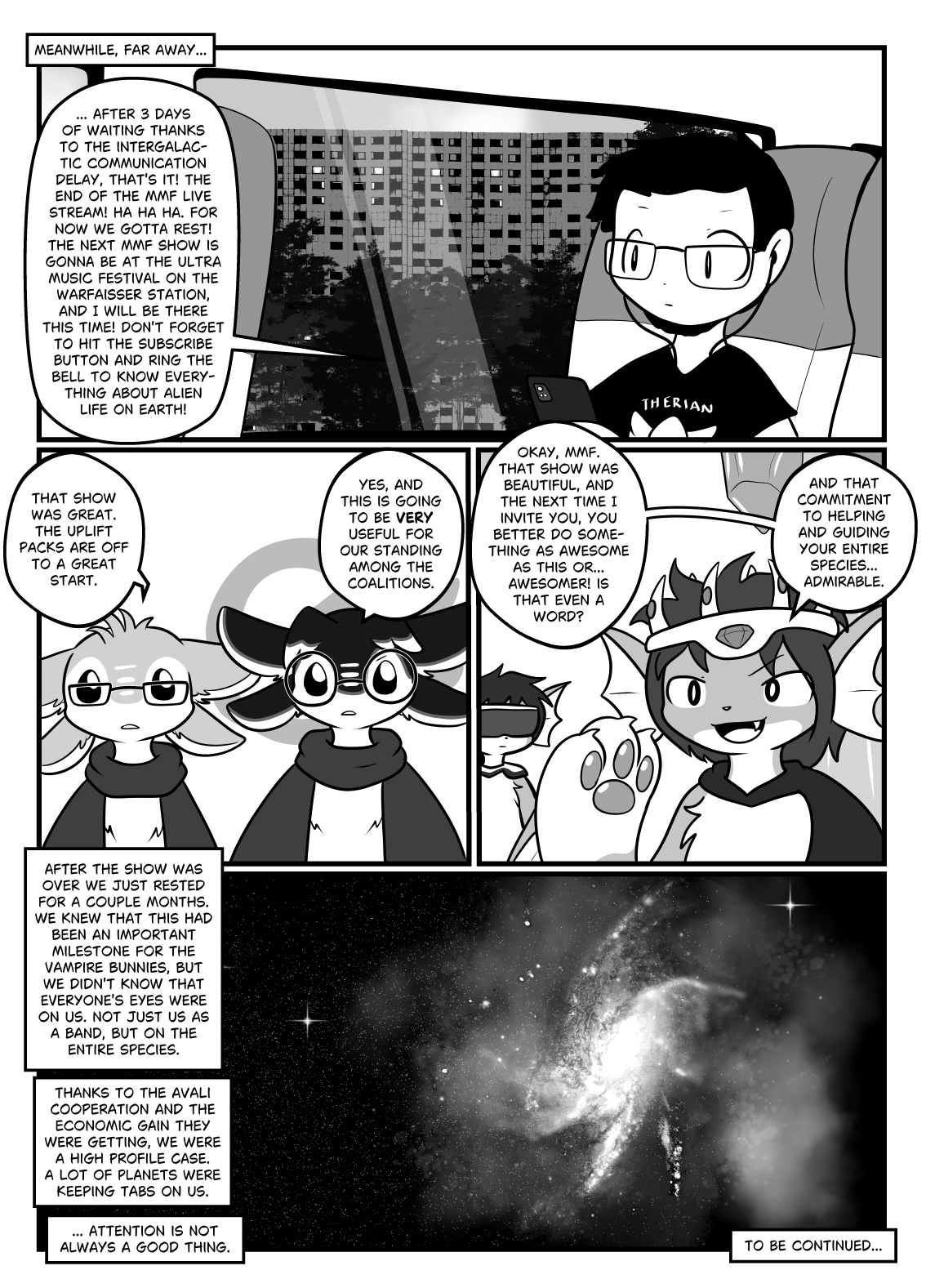 Panel 4 shows the galaxy where Babupekkakerok is located. The narration says. "After the show was over, we just rested for a couple months. We knew that this had been an important milestone for the vampire bunnies, but we didn't know that everyone's eyes were on us. Not just us as a band, but on the entire species. Thanks to the Avali cooperation and the economic gain they were getting, we were a high profile case. A lot of planets were keeping tabs on us..." and then it finishes saying "...attention is not always a good thing. To be continued".